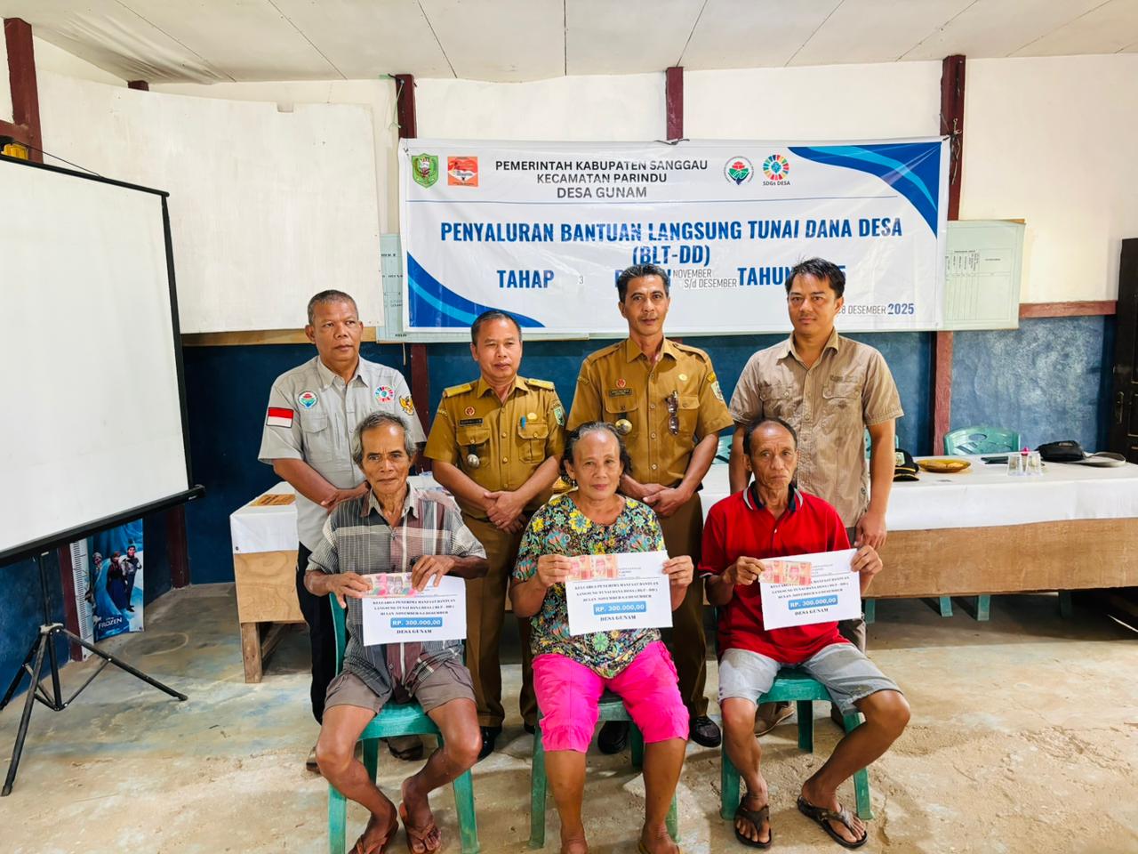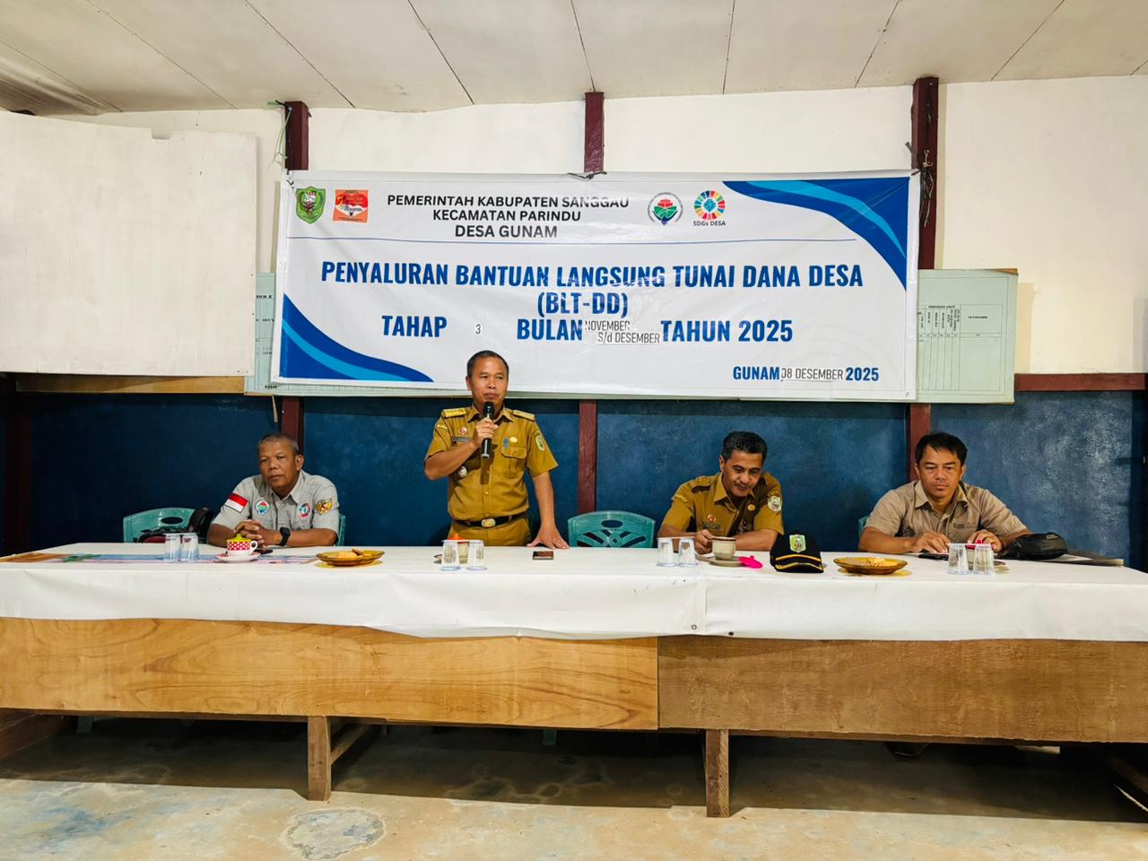 Parindu, 8 Desember 2025 – Camat Parindu didampingi Fasilitator Pemerintahan Kesejahteraan Rakyat (Kesra) menghadiri kegiatan penyaluran Bantuan Langsung Tunai Dana Desa (BLT-DD) Tahap III periode November–Desember Tahun Anggaran 2025 yang dilaksanakan di Desa Gunam, Kecamatan Parindu.