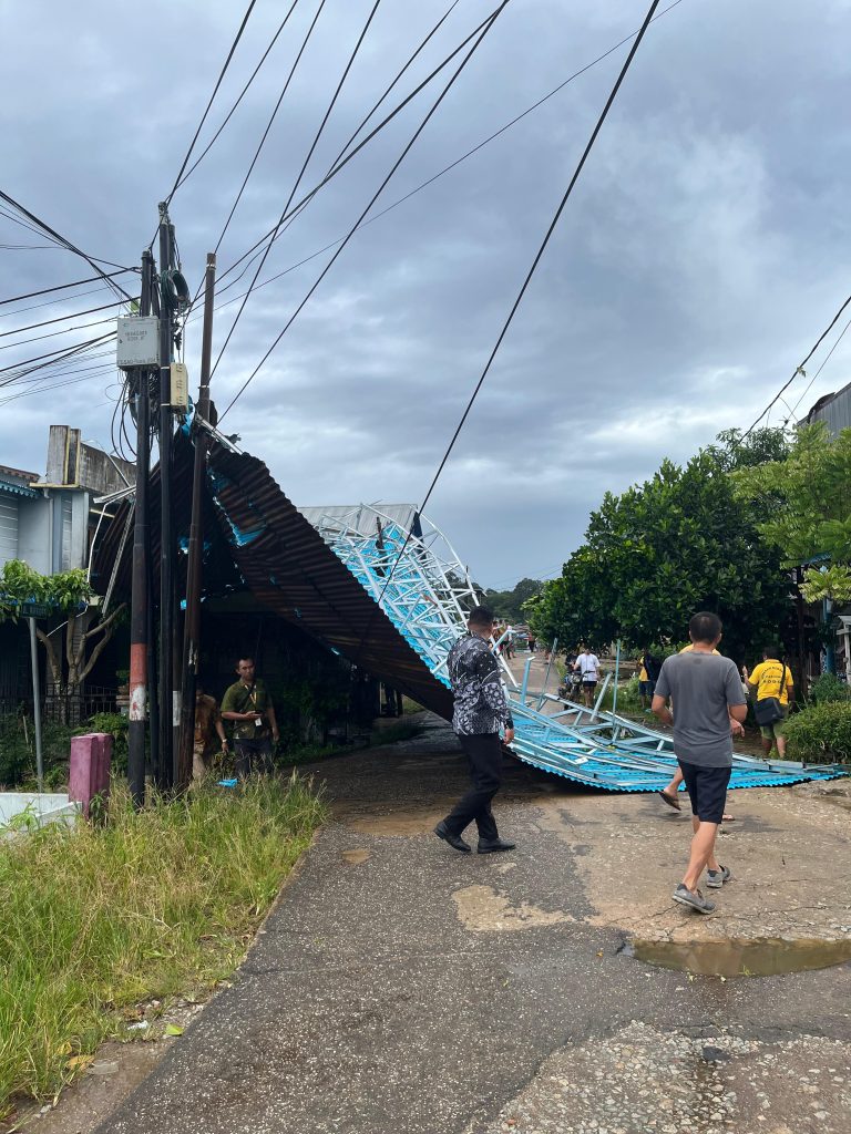 Parindu, 20 November 2025 — Angin kencang melanda Dusun Bodok, Kecamatan Parindu, dan menyebabkan kerusakan pada salah satu bangunan ruko
